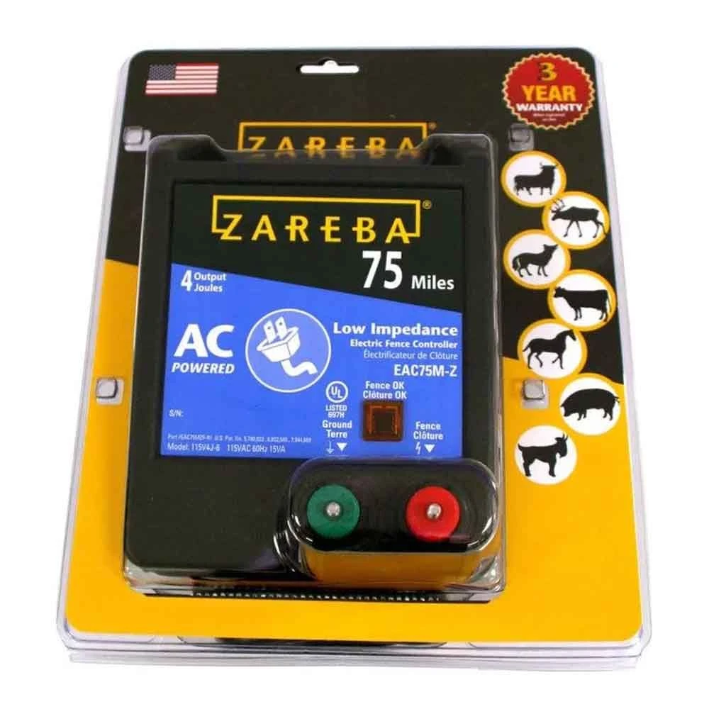 The Zareba® 75 Mile AC Low Impedance Fence Charger to contains livestock inside your fence and keep unwanted wildlife out. This fence energizer can be connected to any electric fencing, including high-tensile wire, polywire and polytape. Features include moisture-resistant internal components, a fuseless design, a rugged, weather-resistant case and a pulse indicator light. This energizer comes with a 2-year warranty that includes protection from damage caused by lightning. Qualify for a free 1-year extension to the warranty when you register your new fence charger online. Your charger’s effectiveness depends on a number of factors, and one of them is the type of fence line you have installed. Steel wire is the most conductive, so it offers the longest electrifiable distance. Your Zareba® electric fence charger can be used in conjunction with electric fence lines to successfully contain or exclude a number of animal types, including bulls, cattle, exotics, goats, horses and pigs. While this plug-in charger will contain your animals, it can also be used to exclude predators, pests animals and other unwanted wildlife. To power your EAC75M-Z, plug it into a standard 2-prong electrical outlet. Since your energizer requires an electrical connection, be sure to protect the energizer and the electrical outlet from severe weather appropriately sheltering them. All plug-in electric fence chargers must be located near an electrical outlet and mounted in a sheltered location. Don’t forget that all electric fence systems require a corresponding ground-rod system.