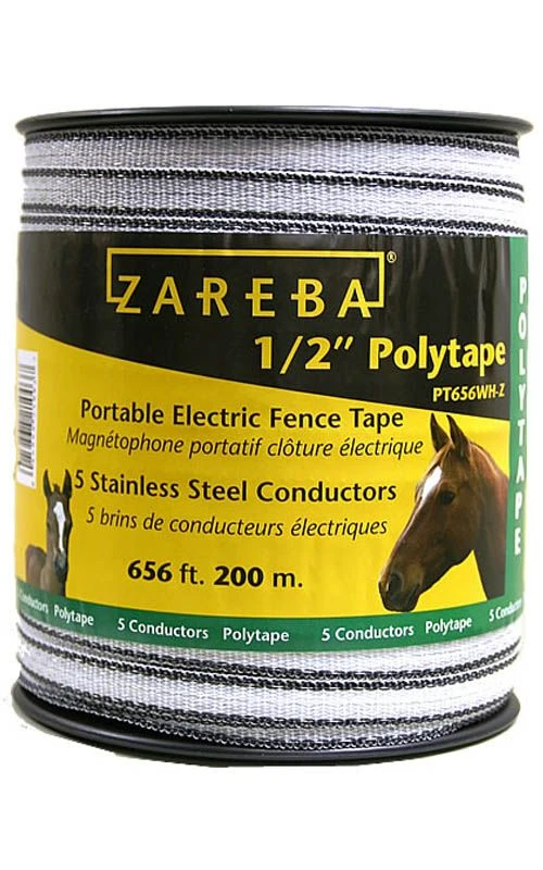 Zareba Electric Fence Poly Tape 1/2 In. contains 5 strands of electrical conductors. It is easy to install and will not rust. It is used for temporary fencing. It is ideal for equine fencing since it is more visible than traditional wire. Easy to install. This fence wire is excellent for containing your horses since it makes it easier for both you and the horses to see the fence. You may also need poly tape insulators and a polytape to fence charger connector to complete your project.